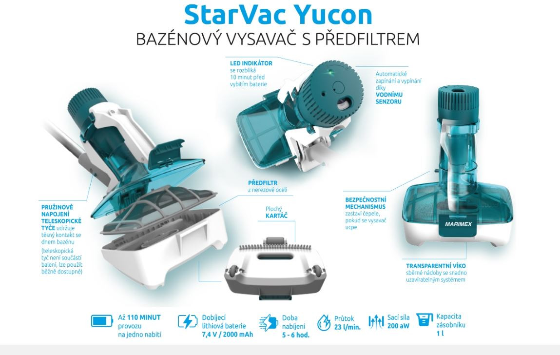 Bezdrátový a přenosný bazénový vysavač Marimex StarVac Yucon je vhodný pro nadzemní i zapuštěné bazény do průměru 4,57 m. Vysavač disponuje automatickým zapínáním a vypínáním díky vodnímu senzoru. Výhodou je i LED indikátor, který vás upozorní na vybití baterie. Vysavač Yucon vydrží pracovat téměř 2 hodiny na jedno nabití.