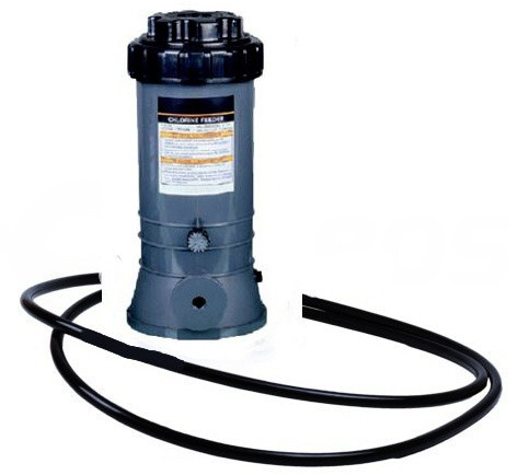 Princip : Dávkovač chloru se instaluje do technické místnosti (šachty) za filtračního zařízení (na výtlaku), připojení pomocí hadiček. Do chlorového dávkovače se vloží několik kusů pomalurozpustných chlorových, nebo bromových tablet v závislosti na objemu bazénu. Při sepnutí filtračního zařízení protéká část vody dávkovačem a tím dávkuje chlor do bazénového okruhu. Množství proudícího chloru lze regulovat, nebo zcela uzavřít regulačním ventilem.