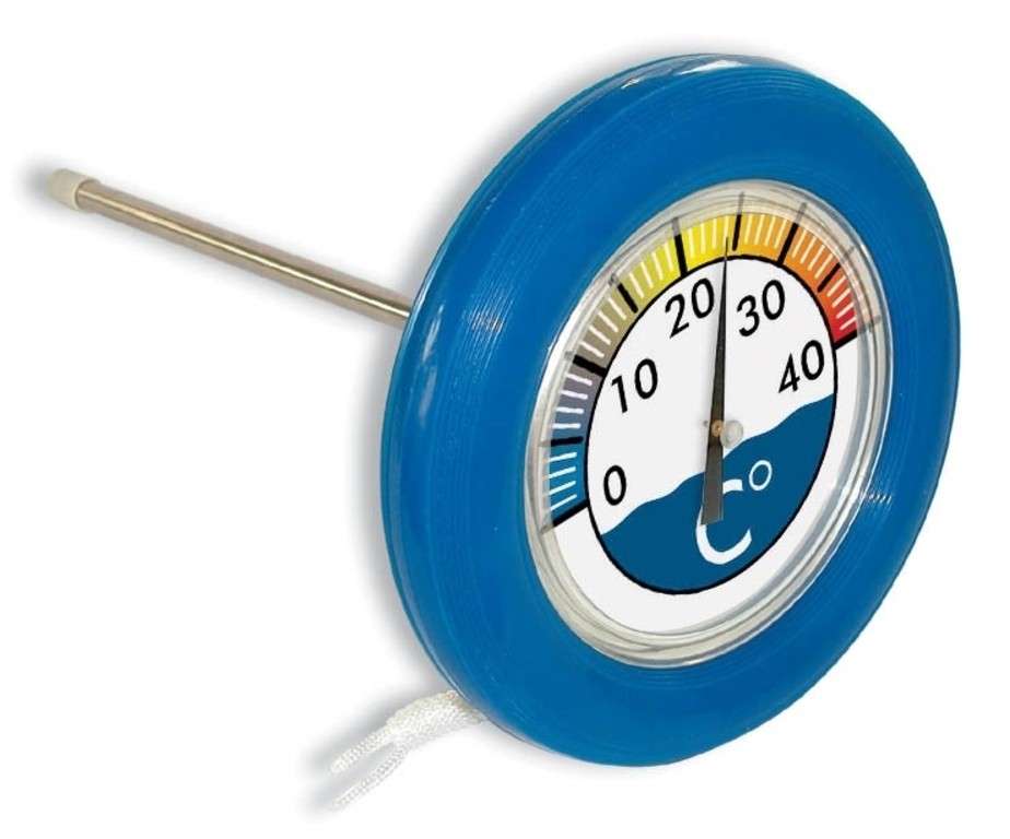 Kulatý plovoucí teploměr. Velká, snadno čistitelná stupnice, provázek pro uchycení teploměru.